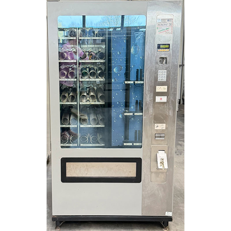 Die Snackartikel werden in einem Spiralsystem präsentiert bzw. gelagert und nach dem First-in-first-out-Prinzip ausgegeben. Warenfächer und Spiralen sind aus hochglänzendem Edelstahl.